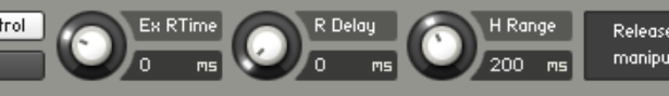 This is an abbreviation for Hold Range, and it sets the Hold time for which the values of the two knobs on the left (Ex RTime knob and R Delay knob) are applied. In other words, if it is not released between the note on time and this H Range value for each note signal, the knob settings on the left are ignored.