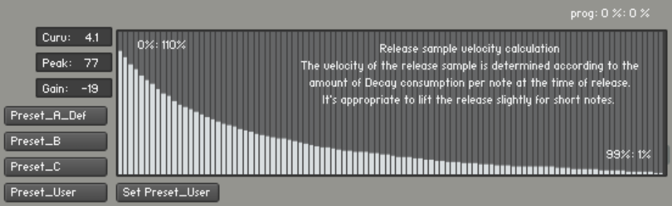 MIDI鍵盤の個性を排除すれば、こちらもデフォルト値:0% でご使用頂くのが最も実際の収録時の反応に忠実です。上級の演奏家の方、または気になる方はベロシティ調整同様、感覚に近づけてご使用ください。同様に結果をお寄せ頂けましたら幸甚です。