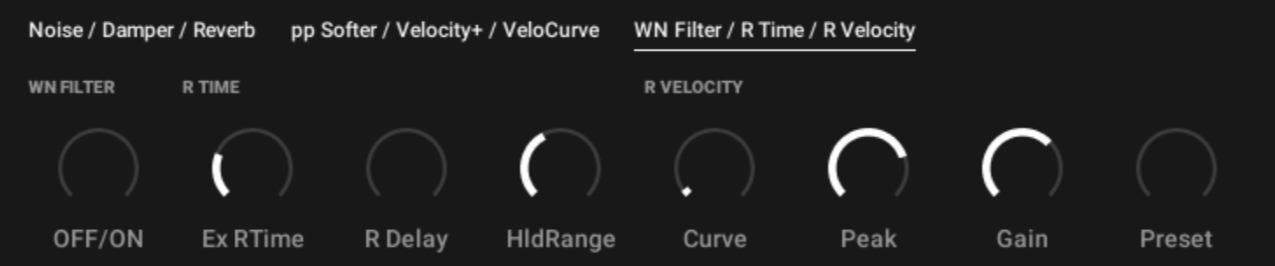 - S/N比優先時のために、主要音およびOverToneサンプルグループに、Decay連動ホワイトノイズフィルターを設置。設定画面「WN Filter」ボタンOnで発効。デフォルトではOff(=ハード・バイパス)